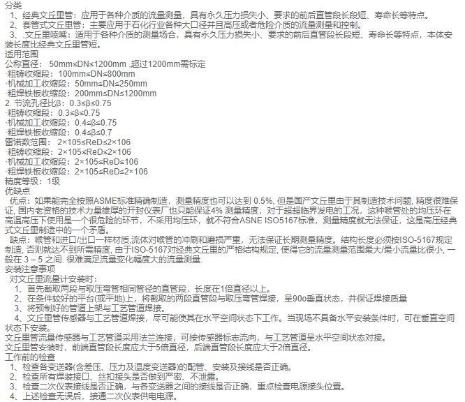 新一代差压式流量测量仪表,其基本测量原理是以能量守恒定律——伯努力方程和流动连续性方程为基础的流量测量方法。内文丘里管由一圆形测量管和置入测量管内并与测量管同轴的特型芯体所构成。特型芯体的径向外表面具有与经典文丘里管内表面似的几何廓形,并与测量管内表面之间构成一个异径环形过流缝隙。流体流经内文丘里管的节流过程同流体流经经典文丘里管、环形孔板的节流过程基本相似。内文丘里管的这种结构特点,使之在使用过程中不存在类似孔板节流件的锐缘磨蚀与积污问题,并能对节流前管内流体速度分布梯度及可能存在的各种非轴对称速度分布进行有效的流动调整(整流),从而实现了高精确度与高稳定性的流量测量。