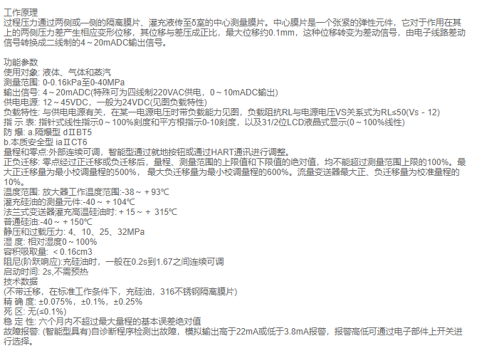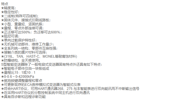 ECA系列电容式变送器是我公司引进国外先进技术和设备,关键原材料、元器件和零部件均采用进口,整机经过严格组装和测试。具有设计原理先进、品种规格齐全、安装使用简便(规格、尺寸与原装EJA完全兼容),外形美观等特点。该产品分智能和普通型两种类型,满足用户的多种选择要求,具有使用价值,目前该系列产品已广泛应用于石油、化工、冶金、电力、食品、造纸、医药、机械制造等行业。