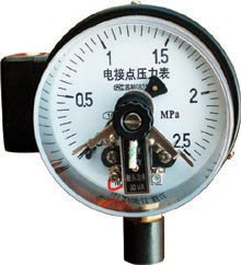 电接点压力表是用于测量对铜和铜合金不起腐蚀作用的气体、液体介质的正负压力,并在压力达到预定值时发出信号,接通控制电路,达到自动控制的报警得目的。 在电接点压力表装置的电接触信号针上,装有可调节的永久磁钢,可以增加接点吸力,加快接触动作,从而使触点接触可靠,消除电弧,能有效的避免仪表由于工作环境振动或介质压力脉动造成触点的频繁关断。所以电接点压力表具有动作可靠、使用寿命长、触点开关功率较大等优点。